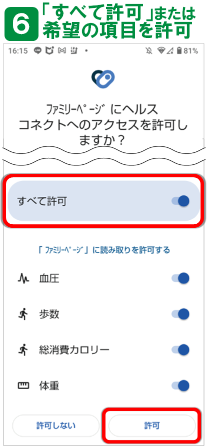 (!)「ヘルスコネクトがインストールされていない、または更新が必要です。」と表示された場合は、ファミリーページの新規登録後、連携設定をお願いします。 ※詳しくはこちら